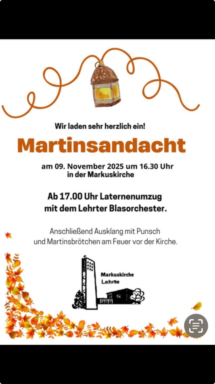 Am 09.11. wird um 16:30 Uhr in die Markuskirche zur Martinsandacht eingeladen! Ab 17:00 Uhr beginnt der Laternenumzug mit Blasorchester und anschließendem Ausklang mit Punsch, Martinsbrötchen und gemütlichem Feuer vor der Kirche! 🔥🍂🎺